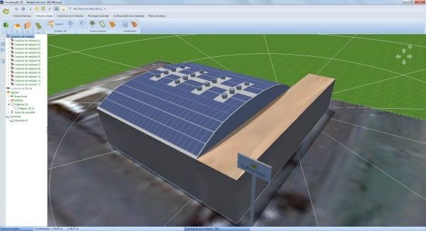 Depois de fazer a modelagem 3D, o PV*SOL define automaticamente uma vista geral do projeto que mostra melhor as áreas fotovoltaicas. Ela é usada na barra da direita e na janela antes de entrar na modelagem 3D, e também no relatório do projeto.