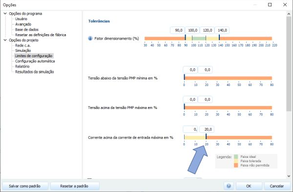 A corrente gerada pelos módulos está crescendo a cada ano, e muitos inversores não conseguem acompanhar essa evolução, já que têm um ciclo mais lento de desenvolvimento. No PV*SOL, é fácil fazer essa configuração: você entra nos limites de configuração, o diálogo onde você informa também o fator de dimensionamento, e cadastra uma tolerância para a corrente.