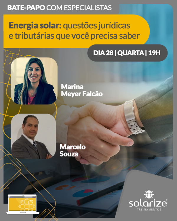 Reuniremos Marina Meyer Falcão (diretora-jurídica da ABGD, especialista em direito da energia) e Marcelo Sousa (ex-diretor comercial na Jinko e na Canadian Solar e atual diretor geral de uma nova multinacional recém chegada ao Barsil) numa conversa técnica sobre Legislação tributária e societária com foco na energia fotovoltaica, abordando a sinergia entre os cursos que ministram na Solarize há mais de dois anos com grande sucesso.