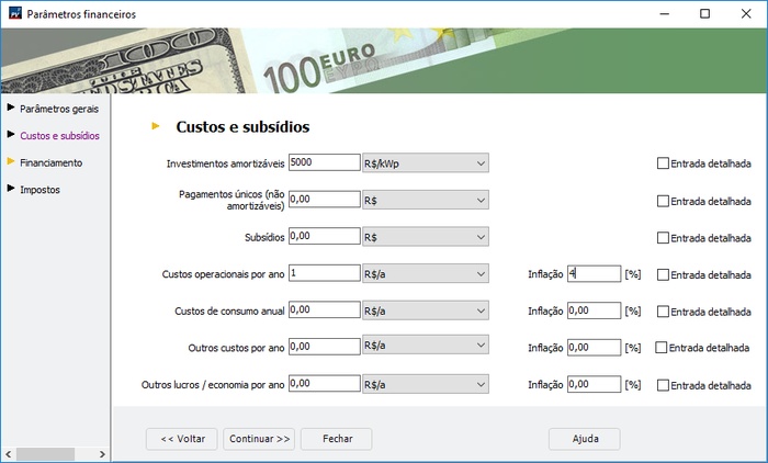 No software PV*SOL, custos e benefícios do sistema solar são informados no passo "Análise financeira". O botão "editar" abre as telas dos parâmetros financeiros, que relaciona os custos e subsídios (veja imagem abaixo).
