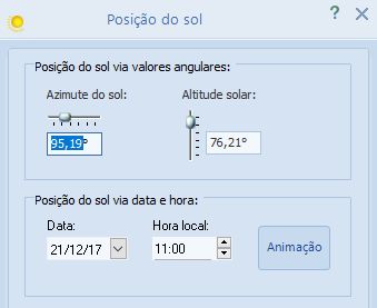 O diálogo que permite ajustar a posição do sol para uma determinada não permite mudar o ano - ele fica travado em 2017. A razão disso é que esta parte do programa é um módulo padrão importado. Para nós, isso não apresenta um problema, já que o percurso do sol é o mesmo a cada ano. Simplesmente desconsidere o ano apresentado.